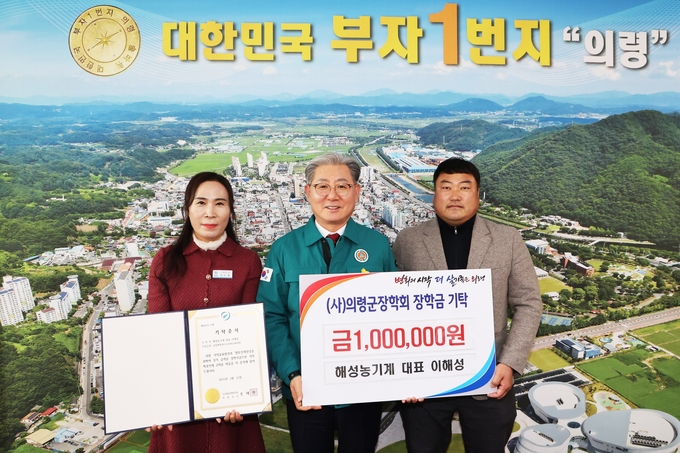 [경남도민뉴스=이상민 기자] 해성농기계(대표 이해성)는 지난 16일 의령군청 방문하여 의령군장학회에 교육발전과 지역인재 양성을 위해 써달라며 장학금 100만원을 기탁했다.