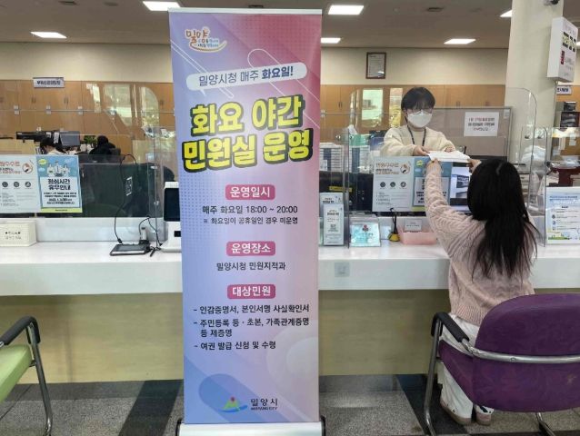 [경남도민뉴스=나희준 기자] 밀양시는 평일 근무 시간 내 민원실 방문이 어려운 민원인의 편의 제공을 위해 매주 화요일(법정 공휴일 제외) 오후 8시까지 시청 민원실을 연장 운영한다고 밝혔다.