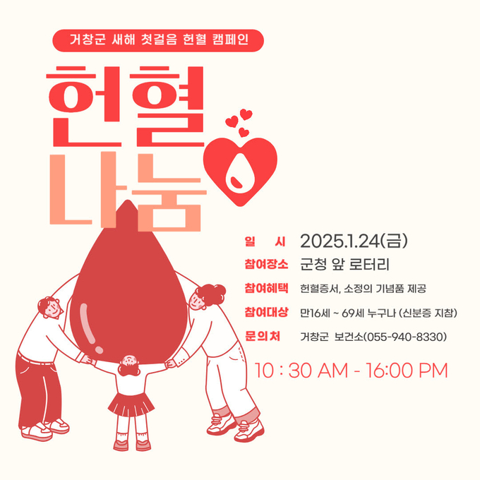 [경남도민뉴스=백형찬 기자] 거창군은 오는 24일 오전 10시 30분부터 오후 4시까지 새해를 맞아 지역 주민과 함께하는 생명 나눔 헌혈 행사를 거창군청 앞 로터리에서 개최한다.