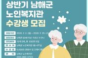 [경남도민뉴스=김부경 기자] 남해군 노인복지관은 2026년 상반기 프로그램 수강생을 2월 2일부터 25일까지 모집한다고 밝혔다. 상반기 프로그램은 평생교육 2강좌, 취미여가 11강좌, 건강증진 3강좌 등 총 15강좌로 구성됐으며, 3월 3일부터 6월 26일까지 운영된다. 세부적인 프로그램은 스마트폰교육, 노래교실, 고고장구반, 손발 마사지 등 다양한 교육이 준비되어 있으며 자세한 사항은 남해군 홈페이지에서 확인 가능하다. 수강생은 선착순으로 모집하며, 수강신청 인원 기준 미달시 해당 프로그램은 폐강된다. 수강료는 강좌당 5천원으로 교재비와 재료비는 별도다. 기초생활수급자, 국가유공자, 등록장애인은 무료이며 차상위계층은 수강료의 50%가 감면된다. 수강을 원하는 군내 60세 이상 어르신은 남해군 노인복지관(055-860-3723)으로 방문하시거나 팩스(Fax : 860-3725)로 신청하면 된다. 남해군 관계자는 “어르신들의 건강하고 활기찬 노후생활을 도모할 수 있도록 건강 증진, 평생교육, 취미생활 등의 다양한 분야별 프로그램를 마련했다”며 “준비한 프로그램 수강을 통하여 어르신들이 신체적·정신적으로 더