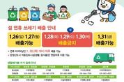 [경남도민뉴스=김미순 기자] 파주시는 환경미화원의 휴무를 보장하기 위해 설 연휴 기간인 1월 28일부터 30일까지 생활 쓰레기를 수거하지 않는다고 밝혔다. 연휴 동안 배출하지 못한 쓰레기는 1월 30일 오후 6시부터 내놓을 수 있다. 단, 운정신도시 내 자동집하시설이 설치된 지역은 설 연휴에도 평소처럼 집하시설을 통해 종량제봉투를 정상적으로 배출할 수 있다. 시는 연휴 시작 전인 1월 17일부터 24일까지를 ‘설 맞이 청결 주간’으로 정하고, 일제 대청소를 실시해 청소 취약지역을 정비할 예정이다. 또한, 쓰레기 무단투기 근절을 위해 단속반을 투입해 상습 불법 투기 지역, 유동인구 밀집 지역 등을 대상으로 집중 단속을 벌인다는 계획이다. 아울러, 시는 연휴 기간인 1월 25일부터 30일까지 자원순환과 상황반을 운영해 민원 등에 신속하게 대처하고, 청소대행업체에서는 15개의 기동반을 배치하여 쓰레기 관련 불편 사항과 민원을 신속하게 처리할 계획이다. 심재우 자원순환과장은 “쓰레기 수거가 중단되는 기간에 배출을 자제하고 일정을 준수해달라”라며 “설 연휴가 끝나는 대로 인력을 투입해 쓰레기를 신속히 수거할