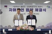 [경남도민뉴스=김완호 기자] 종로구는 9월 23일 구청 기획상황실에서 속초시와 자매결연을 맺었다. 이로써 두 도시는 교육·문화·관광을 비롯해 재난 대응까지 다양한 분야에서 교류와 협력을 강화할 방침이다. 협약 주요 내용은 ▲우수 정책 공유 및 벤치마킹 ▲농수산물 직거래 장터 참여와 전통시장 교류 ▲대표 축제 및 기념식 상호 방문 ▲자매도시 주민 관광지 할인 협의 ▲지역 특색 체험 프로그램 상호 초청이다. 이날 협약식에서 종로구는 북촌전통공방협의회 소속 보석공예 명인 남송 김상실 선생의 자개보석 궁중채화를, 속초시는 동해와 설악산, 크루즈 풍경을 담은 도판화 작품을 교환해 의미를 더했다. 정문헌 구청장은 “종로와 속초가 상호 발전의 동반자로 나아가는 중요한 출발점이 될 것”이라며 “주민 행복 증진과 지역경제 활성화를 위한 다양한 협력 사업을 추진하겠다”라고 밝혔다.