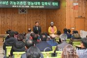 (거창/김은경 기자) = 전국 최고 수준의 귀농 네트워크를 자랑하는 거창군(군수 양동인)은 21일 농업기술센터 3층 대회의실에서 2018년 귀농·귀촌인 영농대학 입학식을 개최했다. 이날 입학식은 영농대학 학장(군수 양동인), 입학생 등 60여명이 참석한 가운데 열렸으며, 입학허가 선언, 강사 소개와 교과 과정 설명 순으로 진행됐다. 이번 귀농·귀촌인 영농대학은 사과반, 딸기반으로 개설됐으며 월 2회, 하루 3시간씩 이론수업과 현장실습을 실시한다. 또한 우수 귀농사례를 엿볼 수 있도록 선진지 견학 등도 실시할 예정이다. 농업을 한 번도 접하지 못했던 귀농인들도 전문적인 기술 습득과 직접 농사를 체험해볼 수 있는 좋은 기회를 얻을 수 있다. 올해 대구에서 귀농한 입학생은, “거창이 공기가 맑고 농사짓기에 적합한 농지도 많은데다가 한편으로는 도시의 성격도 가지고 있어 귀농지로 잘 선택한 것 같다”면서 “영농대학에서 딸기 농사의 고수익 비법을 전수받고 부자가 되도록 노력하겠다”고 밝혔다. 양동인 군수는 “오늘 같이 때 아닌 폭설에도 불구하고 많이 참석해주셔서 감사하다”며 &l