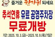 [경남도민뉴스=김춘호 기자] 합천군은 추석 명절을 맞아 귀성객과 지역 주민의 주차 편의를 제공하고 지역경제 활성화에 기여하기 위해 연휴 기간 동안 유료 공영주차장을 무료로 개방한다. 무료 개방 기간은 10월 3일부터 9일까지 7일간이며, 대상 주차장은 합천읍 공영주차장을 비롯해 합천왕후시장 주차장, 삼가면 공영주차장, 농협군지부 앞 공영주차장, 합천약국 사거리 공영주차장, 합천터미널 앞 공영주차장 등 모두 6곳이다. 이번에 개방되는 주차장은 총 282면 규모로, 귀성객과 방문객들이 불편 없이 주차할 수 있을 것으로 기대된다. 군 관계자는 “추석을 맞아 고향을 찾는 귀성객과 군민들이 주차 걱정 없이 편안한 명절을 보내기를 바란다”고 밝혔다.
