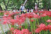 [경남도민뉴스] 15일 경남 함양군 상림공원을 찾은 어린이들이 활짝 핀 꽃무릇을 감상하고 있다.