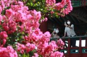 [경남도민뉴스] 21일 오전 경남 함양군 함양읍 학사루에서 붉은빛 배롱나무꽃이 활짝 펴 있다. 배롱나무 꽃말은 ‘마음’이다