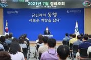 [경남도민뉴스] 함양군은 19일 오전 10시 군청 대회의실에서 서춘수 군수, 강승제 부군수, 간부공무원 및 본청·외청 직원 등이 참석한 가운데 7월 정례조회를 실시했다. 이번 정례조회는 코로나19 거리두기 단계가 상향조정되면서 평시 절반수준의 인원만 참석하고 발열체크, 손소독, 개인 거리유지 등 방역수칙 준수하에 국민의례, 영상시청, 감사패 및 표창수여, 훈시말씀 등으로 진행됐으며, 평소 회의 마지막순서에 군민가를 제창하지만 코로나19 예방차원에서 군민가 영상시청으로 대체했다. 이날 시상에는 6월 말로 퇴임한 백춘기 예비군 함양지역대장이 재임기간 군정발전과 민·관·군 통합방위태세 확립에 기여한 공으로 감사패를 받았으며, 기획감사담당관에서 신속집행 최우수와 시군합동평가 정량평가 1위로 행정안전부 장관 표창과 도지사 표창을, 보건소에서 아토피 천식 예방·관리사업의 대한 공으로 보건복지부 장관 표창을 각각 수상했다. 또한 그 간 업무추진에 대한 공로를 인정받아 선정된 정부모범공무원 2명, 경상남도 자랑스러운 공무원 2명이 증서와 표창을, 상반기 인구늘리기 추진과 근무환경 평가에서 우수한 성과를 낸 본청 2개부서와 2개면에