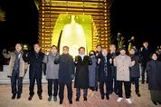 [경남도민뉴스=이돈휘 기자] 경상북도는 경북도청에서 울려 퍼지는 ‘형연(泂然)’의 희망의 종소리와 함께 2025 을사년 새해를 맞이했다. ‘형연’은 ‘맑은소리가 깊고 은은하게 퍼진다’는 뜻으로 3,088개의 폐스피커로 국보 제29호인 성덕대왕신종(에밀레종)을 그대로 재현한 조형물이다. 지난해 12월 경주엑스포대공원에 전시하던 작품을 도청 원당지로 이전 설치했다. 이날 타종식은 전남 무안공항 제주항공 여객기 사고 희생자들에 대한 깊은 위로와 애도 속에서 묵념을 시작으로 경건한 분위기 속에서 진행됐다. 특히 준비됐던 축하공연 등은 취소해 간소화했다. 타종식에는 이철우 도지사를 비롯한 도 기관단체장 등 100여 명이 행사에 참석해 새해를 함께 맞이하며 희망의 종소리에 경상북도의 염원을 실었다. 원당지에는 APEC 2025 KOREA 공식 엠블럼을 설치해 점등식을 하고, 2025년 APEC 정상회의를 역사상 가장 성공적인 회의로 개최해, 경상북도가 대한민국을 넘어 세계의 중심으로 새롭게 도약할 수 있게 만들겠다는 결의를 다졌다. 이철우 도지사는 “2025년에는 초일류 국가 대한민국