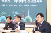 [경남도민뉴스=이돈휘 기자] 경주시가 지역 대학과 협력 강화를 위해 동국대 WISE캠퍼스, 신경주대, 위덕대와 함께 하는 ‘경주시-지역대학 상생협의회’를 개최했다. 지난 17일 청사 내 대회의실에서 열린 이번 회의는 관·학 협력사업 발굴하고 주요 비전을 공유하기 위해 기획됐다. 주낙영 경주시장과 류완하 동국대 WISE캠퍼스 총장, 김일윤 신경주대 총장, 김봉갑 위덕대 총장 등 지역 대학 관계자 30여 명이 참석했다. 이날 회의에서 경주시는 동국대, 위덕대와 함께 경상북도 지역혁신중심 대학지원체계(RISE) 사업의 성공적 추진을 위한 업무협약을 체결했다. 업무 협약에는 △지역 정주와 동반 성장을 위한 특성화 인력 양성 △유지·산·학·연 협력을 통한 상호 연계 △100년 대학으로 발전을 위한 행·재정적 지원 등의 내용이 포함됐다. 이어 경주시는 시정 핵심 비전으로 소형모듈원자로(SMR) 국가산업단지 조성, 미래차 혁신 산업벨트 구축 등 지역의 미래 성장 동력에 대해 논의됐다. 특히 각 대학은 경주의 역점 사업과 연계한 관·학 협력 방안을 제안했다. 경주시는 이날 제