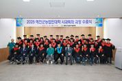 [경남도민뉴스=장강동 기자] 예천군은 30일, 농업인대학생 40여 명이 참석한 가운데 ‘예천군농업인대학 사과 특화과정 수료식’을 개최했다. 이 자리에는 김학동 군수와 강영구 군의회 의장, 도기욱 경북도의원 등 주요 인사들도 참여해 수료자들을 축하했다. 이번 교육은 사과 밀식 및 다축형 재배기술 향상을 희망하는 농가를 대상으로 지난 4월 2일부터 9월 30일까지 ▲수형구성 방법 및 토양관리, ▲기후변화에 따른 재배적 대응방안 등 총 24회(104시간) 교육과정으로 운영됐다. 특히 최근 도입되기 시작한 다축 재배 개원요령 및 초기관리, 정지전정 이론 등 국내 사과재배 유명 강사진의 알찬 강의와 선진지 견학 및 교육생 농장 현장 컨설팅으로 높은 관심과 만족도를 보였다. 교육생 40여명 가운데 35명이 수료했으며, 교육기간 중 교육생 자치활동 공로를 인정받아 임각준(감천면) 교육생이 농촌진흥청장상을 수상했다. 김학동 군수는 “교육생들의 농업인대학 수료를 진심으로 축하한다”며, “앞으로 예천 사과를 이끌어갈 주역이라는 사명감으로 미래형 명품사과 과원 조성을 이끌어 줄 것을 당부드리며, 예천군에서도 지속적인