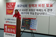 최구식 진주 ‘갑’ 국회의원 예비후보는 17일 진주시청 브리핑 룸 기자회견을 열고 ‘100만 미래도시 진주 프로젝트’비젼을 제시했다. 최구식 예비후보가 제시한 공약전문 ▲ 먼저 2017년부터 2021년까지 항공우주테마파크 만들겠습니다. - 에버랜드급 항공우주 전시 체험·테마파크조성 - 총 사업면적 66만㎡ (약 20만평) - 항공전시관·문워킹/무중력체험·호텔/리조트·워터파크 등 - 항공국가산단과 연계 - 사업소요 예산 6,000억원 (민자,국비,지방비) ▲ 항공우주테마파크와 함께 지상에서 가장 아름다운 꿈의 둘레길·자전거길을 만들겠습니다. - 지상에서 가장 아름다운 진양호 '꿈의 둘레길' 조성 - 신재생에너지 경관조명 및 데크 설치 - 자전거길 및 수변 생태공원 등 친수공간 동시 조성 - 사업소요 예산 800억원 (국비, 지방비) ▲ 호반신도시 건설에 맞춰 호반관광 모노레일을 설치하겠습니다. - 진양호의 수려한 자연경관을 손쉽게 관광 가능한 모노레일 - 노약자·장애인 등 사회적 약자 탑승편의시설 구축 - 일본 오사카 및 순천만