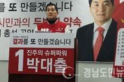 새누리당 박대출 진주갑 국회의원 예비후보는 22일 진주시청 브리핑룸에서 기자회견을 청해 20대 총선 공약·비전과 진주 국회의원 예비후보 최초로 공약CF를 발표했다. 이날 발표한 공약은 프로젝트명 '남강 르네상스'를 통해 진주를 '스포츠관광문화 도시' 만들겠다는 포부를 밝혔다. ' 박대출 예비후보의 남강 르네상스 공약 ' ▲ 남강 레포처(레포츠+컬처) : 남강을 뱃길과 수상레포츠를 즐길 수 있는 공간으로 만들어 보고·듣고·즐기고 체험할 수 있는 남강 만들기 ▲ 진양호 일대 체험 밸리(valley) 조성 : U-Park1(유·청소년스포츠 체험센터) 예산확보, U-Park2(문화예술 분야 등) 건립, U-Park3((유·청소년 친환경 직업·적성 체험장, 어린이 놀이터, 야외식물원) 조성을 통해 U-Park1 시너지 극대화 ▲ 천전광장(*C-Park 조성) : 천전동 강변에 상징탑 건설 및 광장거리 조성 ▲ 가호동 개방형 스포츠 종합관 완성 : 수영장, 치유의 숲, 치유욕탕, 피트니스 센터 조성, 247억원 전액 국비확보 ▲ 개천예술제 공연 규모