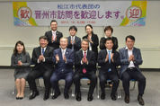 (진주/최광용 기자) = 진주남강유등축제 등 10월 축제기간을 맞아 해외 외빈들이 연이어 진주시를 찾는 가운데, 일본 마쓰에 시의 마쓰우라 마사타카 시장 일행이 진주시를 방문해 10월 축제장과 시 주요 기관 등을 둘러보았다. 마쓰에시는 일본문화의 발상지로서 오랜 역사와 문화를 간직한 신지호반의 온천 등 유명한 관광도시로 양 도시는 1999년 우호교류 체결한 이후 문화, 관광, 경제 등 다양한 분야에서 교류를 이어 오고 있다. 일본 마쓰에시의 마쓰우라 마사타카 시장과 모리카와 하야토 의장 등 6명으로 구성된 대표단은 지난 9일부터 오는 11일까지 2박 3일의 일정으로 진주시를 방문하여 향후 협력방안을 논의했다. 진주의 10월 축제장을 관람하고 10일 시민의 날 기념식에서 거리 퍼레이드에도 함께 참석하여 축제를 마음껏 즐겼다. 유등축제장을 둘러본 마쓰에 방문단은 대한민국 글로벌축제인 진주남강유등축제의 세계적인 규모 및 남강과 진주성을 배경으로 어우러진 유등의 아름다움에 반하여 탄성을 자아냈다. 마쓰에 방문단은 장난감은행이 있는 육아종합지원센터를 방문하여 전반적인 운영사항과 시설을 견학했으며, 이어 진주아카데미로 이동해 학생 및 학부모 대상 영어프로그램 운영사항