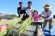 (산청/최광용 기자) = 산청군 금서면 동의보감촌에서 14일 풍년을 기원하는 세시풍속인 ‘올게심니’ 행사가 열린 가운데 허기도 산청군수와 최영식 산청군농협 지부장이 행사에 참가한 한 어린이와 함께 탈곡체험을 하고 있다. ‘올게심니’는 한가위를 전후해 잘 익은 벼, 수수, 조 등 햇곡식의 이삭을 한줌 베어다가 묶어 기둥에 걸어 두는 것을 말한다. 이웃을 불러 술과 음식을 대접하는 세시풍속으로 이듬해 풍년이 들게 해달라는 기원의 뜻이 담겨 있다.