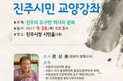 (진주/최광용 기자) = 진주시는 오는 28일 오후 3시 진주시청 시민홀에서 강신웅 경상대 명예교수를 초빙하여 ‘진주의 유구한 역사와 문화’라는 주제로 『제64회 진주시민 교양강좌』를 개최한다. 강신웅 교수는 서울대를 졸업하고, 경상대 인문대학에서 교수로 35년간 재직하면서 최우수 교수로 선정된 바 있으며 현재 진주문화원 향토문화연구소장을 맡아 지역의 역사와 문화, 고전 인문학을 연계하는 향토인문학 강좌를 개설하여 성황리에 진행하고 있다. 진주시 관계자는 빛과 예술의 향연, 글로벌 명품 축제 진주남강유등축제를 앞두고 축제를 더욱 의미 있게 즐길 수 있는 기회가 될 이번 강좌에 많은 시민의 참여를 당부했다. 한편, 64회째를 맞이한 진주시민 교양강좌는 그동안 사회 저명인사를 초빙해 교육, 건강, 경제, 문화 등 다양한 분야에서 유익한 강좌를 운영하여 진주시민들에게 많은 호응을 얻어 왔다. 자세한 내용은 진주시 평생학습센터 홈페이지(http://lifelong.jinju.go.kr)를 참조하거나 전화(055-749-8322)로 문의하면 된다.