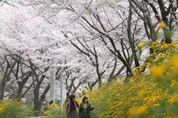 11일 산청 황매산 진입로인 산청군 차황면 신촌마을 입구 달음재 주변 도로에 연분홍 색의 벚꽃과 황금색의 황매화가 어우러져 아름다움을 뽐내고 있다.
