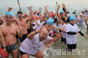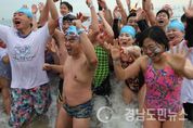 7일 해운대 해수욕장에서 열린 '제 31회 해운대 북극곰수영축제'에 참가한 시민들이 추위를 이기기 위해 포효하고 있다.