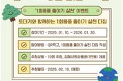 [경남도민뉴스=최미정 기자] 김해시는 매월 10일을 ‘일(1)회용품 없는(0) 날’로 지정해 참여형 이벤트 등 다양한 실천 프로그램을 운영한다고 8일 밝혔다. 시는 생활 속 자원순환 실천 확산을 위해 1회용품의 ‘1’과 ‘없다’는 의미의 숫자 ‘0’을 조합해 매월 10일을 1회용품 없는 날로 정해 일상에서 1회용품 사용을 줄일 수 있도록 홍보와 참여형 프로그램을 지속적으로 추진하고 있다. 먼저 홀수 달 10일부터 30일까지는 ‘토더기가 알려주는 1회용품 줄이기 실천 꿀팁’ SNS 이벤트를 운영한다. 김해시 공식 SNS에서 자원순환 정책과 1회용품 줄이기 실천 방법을 소개하고, 퀴즈 참여자 중 10명을 추첨해 김해사랑상품권 또는 친환경 제품을 제공한다. 당첨자는 짝수 달 10일 김해시 SNS에서 발표한다. 또 짝수 달 10일에는 자원순환 캠페인과 연계한 홍보 활동을 진행하고 각종 축제와 행사 현장에서 홍보부스를 운영해 시민들의 생활 속 1회용품 줄이기 실천을 적극 유도한다. 이용규 시 자원순환과장은 “매월 10일 1회용품 없는 날 시민들이 부담 없이 친환경 실천에 동참하길 바