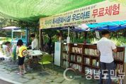 (함양/최병일) = 새마을문고함양군지부(회장 김삼철)는 지난 24일 오전 11시 상림숲 머루터널 입구에서 남녀새마을지도자 30여 명과 황태진 군의회의장을 비롯한 군의원들이 참석한 가운데 피서지 독서문화시설 및 환경안내소를 개소했다. 피서지독서문화시설은 매일 문고지도자 및 새마을지도자가 3명씩 윤번제로 지난 24일부터 8월 13일까지 오전9시30분부터 오후 5시까지 운영한다. 무더위를 피해 시원한 상림을 찾는 군민과 관광객에게 독서의 즐거움은 물론 어린이들에게는 우드아트 무료체험도 실시하며 새마을지도자함양군협의회(회장 양경모), 함양군새마을부녀회(회장 서순이)에서도 환경안내소를 운영하여 환경정화활동, 에너지 절약 캠페인으로 홍보용 부채(500개)등을 배부하고 있다. 김삼철 회장은 “체험활동 및 도서는 무료로 대여하고 있으며 아동도서, 일반도서등 1,500여 권을 비치하고 있다”며 “시원한 상림숲에서 독서를 즐기며 가족과의 체험활동으로 즐거운 문화활동을 즐기는 장이 되기를 바란다”고 밝혔다.