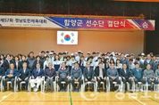 (함양/최병일) = 경남도민체전 5위를 목표로 한 함양군 선수단이 선전을 다지는 결단식을 시작 결전지인 진주로 향했다. 함양군은 27일 오후 3시 고운체육관에서 도민체전에 출전하는 임원과 선수를 비롯하여 기관단체장 등 400여 명이 참석한 가운데 제57회 경남도민체육대회 결단식을 가졌다. ‘뭉쳐라 진주에서 솟아라 경남의 힘’이라는 슬로건으로 27일부터 오는 30일까지 진주시 일원에서 열리는 제57회 경남도민체육대회는 18개 시군 선수 및 임원 2만여 명이 참여하여 27개 종목(정식 25·시범2)에서 기량을 겨룬다. 함양군은 이번 도민체육대회에서 육상과 축구, 배구, 탁구 등 19개 종목에 선수 366명과 임원 157명 등 523명의 대규모 선수단이 출전하여 군부종합 5위를 목표로 구슬땀을 흘려 왔다. 강현출 권한대행은 “오늘부터 4일간 진주시에서 개최되는 도민체전의 장도에 앞서, 승전의 굳은 의지와 필승의 각오를 다지기 위해 이 자리에 모였다”며 “선수 여러분께서는 우리군을 대표하여 출전하는 만큼 긍지와 자부심을 가지고, 그동안 갈고 닦은 기량을 유감없이 발휘하여 선수 개인의 영광은 물론,