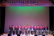 (거창/최병일) = 거창군 거창읍(읍장 전덕규) 주민자치위원회(위원장 김판남)는 지난 2일 저녁 거창문화원에서 2017년 프로그램 수강생들의 기량을 뽐내기 위한 주민자치 프로그램 발표회를 열었다. 이날 행사는 여러 기관단체장들과 500여 명의 읍민이 모인 가운데 마중소리 난타팀의 식전공연을 시작으로 진행했다. 지난 거창한마당대축제에서 행복나눔, 이웃사랑 모금 부스를 운영해 모은 수익금 전액을 어려운 이웃을 돕기 위해 기탁했다. 나현재 노래교실, 하모니카 교실, 줌바댄스, 지난 거창군 프로그램 경연대회에서 우승한 시니어라인댄스팀이 공연을 했다. 문화원 로비에는 캘리그라피반의 작품 전시회를 열어 그간의 실력을 뽐냈다. 마지막 공연은 거창읍 주민자치위원회 위원들이 옷을 맞춰 입고 ‘아! 대한민국’을 부르며 합창과 감사인사로 막을 내렸다. 김판남 위원장은 “이번 주 일요일 5일 오전 10시부터 오후 3시까지 읍사무소 앞 잔디광장에서 칼갈이, 빈화분심어주기, 구두수선, 이혈서비스를 하는 주민서비스의 날도 운영할 계획이니 많은 관심과 참여를 바란다”고 말했다.