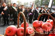 (거창/최병일) = 거창군은 지난 4일 롯데백화점 광주점에서 거창사과를 사랑해 주신 광주시민 여러분께 사랑과 감사의 마음을 전하는 거창사과데이 행사를 열었다. 매년 11월 4일에 개최하는 거창사과데이는 올해로 벌써 7회째를 맞이하며 거창사과를 홍보하는 효자 노릇을 톡톡히 하고 있다. 이 날 행사는 양동인 거창군수를 비롯해 김종두 군의회의장과 군의원, 신용인 농협중앙회거창지부장, 지역농협장, 거창사과발전협의회장, 거창 사과재배농업인과 광주시민 등 2,000여명이 참석한 가운데 거창사과와 즉석 생사과즙 시식, 문자사과 무료증정, 기능성사과 판매 등 롯데백화점을 찾은 고객들에게 맛있는 거창사과 시식과 구매기회를 제공했다. 특히 11월 수능을 겨냥한 합격 문자사과 배부와 오메가3사과 판매는 수험생 부모와 가족들에게 큰 호응을 얻었다. 군 관계자는 “소비자가 맛있는 거창사과를 맛보고 쉽게 구매할 수 있도록 찾아가는 마케팅 행사를 지속적으로 열어 ‘사과’하면 ‘거창’이 떠오를 수 있도록 노력하겠으며 사과는 ‘선물’이 아닌 ‘생활’이라는 사과건강 캠페인으로 사과소비 촉