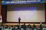 [경남도민뉴스=최인태 기자] 김관영 전북특별자치도지사가 21일 무주군을 찾았다. ‘2026년 도민과의 대화’를 위해 무주를 방문한 김관영 지사는 먼저, 무주반딧불시장에서 상인들을 만나 애로사항을 청취하고 지역경제 활성화 의지를 전달했다. 이어 무주예체문화관 다목적홀에서 진행된 행사에는 황인홍 무주군수와 오광석 무주군의회 의장, 윤정훈 도의원을 비롯한 무주군민 4백여 명이 참석해 ‘2036 하계올림픽 유치 기원’ 행사에 함께하며 도약을 위한 공생을 다짐했다. 황인홍 무주군수는 환영사에서 “K-관광수도 자연특별시, 무주에 오신 것을 진심으로 환영한다”라며 “도와 손잡고 희망찬 미래를 향해 나아갈 수 있다는 데 자긍심을 느낀다”라고 전했다. 이어 “무주가 세계 최우수 관광마을이자 전북을 대표하는 거점 관광도시로 더 힘찬 도약을 해 나갈 수 있도록 든든한 버팀목이 돼 달라”고 말했다. 특강을 통해 “여민유지(與民有志)와 도전경성(挑戰竟成)의 도정 철학을 바탕으로 초심을 지키며 전북의 미래를 열어가겠다”라고 말문을 연 김관영 지사는 “무주가 가진 생태·관광 자원을 기반으로 체류형 관광과 지역경제 활성화를 이
