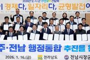 [경남도민뉴스=최인태 기자] 전라남도는 16일 전남도청 왕인실에서 ‘2026년 도-시군 상생협력 간담회’를 열어 지역 대도약을 위한 광주·전남 행정통합 추진에 도와 22개 시군이 공동 보조를 맞추기로 했다. 간담회는 김영록 전남도지사와 22개 시장·군수 등 관계자 100여 명이 참석한 가운데, 광주·전남 행정통합 추진계획과 전남도 재생에너지 추진전략을 중심으로 발표와 토론이 진행됐다. 이들은 광주·전남 행정통합을 통해 대한민국 제1호 통합 광역지방정부 출범을 목표로, 도와 시군이 상생 협력 의지를 재확인하고, 전남의 미래 성장 전략을 논의했다. 특히 특별법 제정안을 중심으로 행정통합 추진 경과와 향후 일정을 공유하고, 전남을 대한민국 첨단산업을 이끄는 ‘재생에너지의 심장’으로 육성하기 위한 시군의 협력 방향과 역할 분담에 공감대를 형성했다. 김영록 지사와 전남시장군수협의회는 광주·전남 행정통합 환영 성명서를 발표하고, 초광역 경제 중심지 도약을 위한 행정 통합에 적극 협력할 뜻을 밝혔다. 또한 22개 시군의 고유한 특성과 자율성이 존중되는 균형발전형 통합과 민주적 합의, 도민 공감대 형