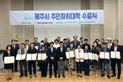 [경남도민뉴스=하형수 기자] 현원돈 제주시 부시장은 27일 평생학습관 대강당에서 열린 ‘제4기 제주시 주민자치대학 수료식’에 참석해 교육과정을 마친 수료생들에게 축하의 인사를 전했다. 이날 수료식에서는 지난 6월부터 9월까지 4개월간 주민자치대학에서 ▲기본소양(지역문제 갈등관리 및 해결과정ㆍ제주 이해를 위한 미술관 속 세계여행), ▲지방자치(제주의 지속가능발전 목표ㆍ주민자치회 도입과 주민자치 우수사례 등), ▲실무역량(Chat GPT 이해와 주민자치 활용ㆍ주민자치 퍼실리데이터 교육 등), ▲워크숍 등의 교육을 이수한 33명에게 수료증이 전달됐다. 한편, 이번 주민자치대학은 (사)한국지역혁신연구원에 위탁해 제주특별자치도 소통협력센터에서 15주 동안 매주 목요일 오후 6시 30분부터 2시간 교육을 진행했다. 현원돈 제주시 부시장은 “이번 교육과정을 통해 습득한 지식과 경험이 지역사회 발전에 적극적으로 활용되길 바란다”며, “특히, 제주형 주민자치회 출범 등 주민자치의 새로운 방향을 모색하고 있는 시기에 여러분의 활동이 풀뿌리 민주주의 정착과 주민 주도 자치문화 확산에 큰 힘이 될 것이라 기대한다”고 전했다.