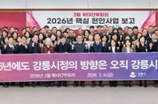 [경남도민뉴스=류종길 기자] 강릉시는 6일 오후 1시 30분 시청 2층 대회의실에서 김홍규 시장 주재로 확대간부회의를 개최했다. 이날 회의는 김상영 부시장을 비롯한 간부 공무원 90여 명이 참석했으며, 31개의 신규 핵심 현안사업을 포함한 총 76개 핵심 현안사업의 추진현황과 추진계획에 대한 점검이 이뤄졌다. 시는 지난 1월 2026년 주요업무계획 보고를 통해 부서별 핵심 추진 과제를 공유하고 신규시책을 발굴하여 2026년 핵심 현안사업을 선정했으며, 민선8기 결실을 맺는 해인 만큼 책임감 있는 사업추진을 통해 가시적인 성과를 창출할 계획이다. 신규 핵심 현안사업으로는 △파인에듀시티 강릉 교육발전특구 조성 △강릉중앙고등학교 학교복합시설 건립 △의료·요양 통합돌봄 지원 「강릉안애(安愛) 통합돌봄」 △강릉시립복지원 증축 △강릉시 보건타운 조성 △강동면 안인진리 축구경기장 조성 등 창의적 문화예술교육 도시로서의 기반을 다지고, 시민 모두가 함께 누리는 복지도시 조성을 위한 사업들이 포함됐다. 또한 △도시바람길숲 조성사업 △정동·심곡항 어촌뉴딜3.0 △교1동 분수공원 복합활력센터 조성사업 △명주남문동 도