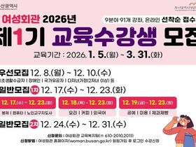 [경남도민뉴스=신석주 기자] 부산시 여성문화회관은 오는 내일(8일)부터 '2026년 제1기 문화교실' 수강생을 모집한다고 밝혔다. '여성문화회관 문화교실'은 우수한 강사진을 토대로 시민의 다양한 문화 욕구에 부합하는 배움의 장을 제공하는 평생교육 프로그램이다. 시민들에게 전문적인 능력개발과 삶의 질 향상을 위한 폭넓은 기회를 제공하고자 시 여성문화회관이 운영하고 있다. 2026년 제1기 문화교실은 내년 1월 2일부터 3월 28일까지 11주간 진행되며, 전통·어학·요리·예술·현대생활 5개 분야 97개 강좌에서 1,913명의 수강생을 모집할 예정이다. 이번 교육 과정에는 전통 분야를 비롯한 다양한 문화예술 강좌와 취·창업 등에 도움이 되는 자격증 강좌, 직장인을 위한 야간·주말 강좌가 운영될 예정이다. ▲문화예술 강좌로는 가야금, 기타, 꽃꽂이 등이 있으며 ▲자격증 강좌로는 제빵(베이킹), 컴퓨터 자격증 과정 등이 있다. 또한, ▲야간에 운영되는 필라테스․요가, 커피 바리스타 과정, 사진예술 등의 강좌 ▲주말 과정인 전통주·꽃차, 여행영어 과정 등도 만나볼 수 있다. 18세 이