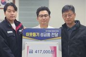 [경남도민뉴스=최미정 기자] 양산시 덕계동은 ㈜천호엔케어 양산공장(공장장 조광보)에서 12일 덕계동행정복지센터(동장 김지욱)를 방문해 어려운 이웃에게 후원해달라며 후원금(417,160원)을 기탁했다고 밝혔다. 매곡그린공단에 위치한 ㈜천호엔케어 양산공장에서는 직원들의 참여로 열린 아나바다 행사를 통해 얻어진 수익금을 필요한 곳에 써달라며 후원했다. 조광보 공장장은 “적은 금액이지만 직원들의 정성으로 모은 성금이 덕계동 관내 어려운 이웃들에게 조금이나마 도움이 되었으면 하는 마음에 기탁을 하게 됐다”며 “앞으로도 꾸준히 지역사회를 위한 활동을 하겠다”고 말했다. 김지욱 덕계동장은 “관내 취약계층을 위해 나눔을 실천해주신 ㈜천호엔케어 양산공장 관계자 분들에게 감사드린다”며 “후원금은 필요한 관내 저소득 취약계층에 잘 전달하겠다”고 전했다.