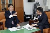 [경남도민뉴스=박만수 기자] 김영환 지사가 2026년도 정부예산 확보를 위해 연일 국회를 오가며 ‘광폭 행보’를 이어가고 있다. 김 지사는 11월 14일 국회를 방문해 한병도 국회 예산결산 특별 위원회 위원장, 박형수 국민의힘 예결위원회 간사, 김도읍 국민의힘 정책위의장을 차례로 만나 충북도의 주요 핵심사업이 국회 증액 심의 과정에서 반영될 수 있도록 적극 건의했다. 이번 방문은 지난 11월 5일 국민의힘 충청권 예산정책협의회, 11월 12일 지역 국회의원 예산정책협의회와 송언석 국민의힘 원내대표 면담에 이은 세 번째 일정으로, 김 지사는 충북의 주요 현안사업과 지역 균형발전을 위한 국비 지원의 필요성을 설명했다. 이날 중점적으로 건의한 사업은 다음과 같다. ▲청주국제공항 민간전용 활주로 건설(사전타당성조사 용역비 5억 원) ▲KAIST 부설 충북 AI BIO 영재학교 설립(공사비 등 147억 원) ▲미호강(국가하천) 홍수예방사업(설계비 20억 원) ▲충주댐 수력기반 그린수소 인프라구축(설비공사비 등 56.4억 원) ▲제천(청풍호) 내륙 국가어항 지정(설계비 15억 원) ▲청주 남이 부용외천 ~ 양촌(국도 1