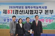 [경남도민뉴스=최민숙 기자] 경산교육지원청은 2025년 11월 13일 대학수학능력시험 시행을 앞두고 12일 경산시험지구 업무 추진을 격려하기 위하여 임종식 경상북도교육감이 방문했다고 밝혔다. 경산(87)시험지구에서는 2026학년도 대학수학능력시험에 총 2,591명이 응시하며, 경산교육지원청 본부 관계자들은 경산·청도지역 8개 시험장 98개 시험실에서 차질 없는 시험 진행을 위해 총력을 기울이고 있다. 임종식 경상북도교육감은 업무를 수행하는 담당자들의 노고에 감사를 표했으며 ‘최적의 시험장 환경을 조성하여 모든 학생이 공정하고 안정적으로 시험을 치를 수 있도록 만전을 기하여 지원해주기를 바란다’라고 했다. 이에 정수권 교육장은 ‘시험본부와 모든 시험장에 근무하는 관계자와 긴밀하게 협력하여 모든 수험생이 안전하고 편안하게 수능에 응시할 수 있도록 최선을 다하겠다’라고 했다.