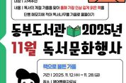 [경남도민뉴스=백상현 기자] 대구동부도서관은 11월 5일부터 28일까지 동부도서관 영어특화자료실과 누리집에서 ‘2025년 11월 독서문화행사’를 운영한다고 밝혔다. 이번 행사는 가을 독서 문화를 활성화하고 지역주민의 독서 활동을 장려하기 위해 마련됐다. 프로그램은 ▲올해 읽은 책을 단풍 메모지에 적어 독서나무를 완성하는 ‘나를 웃기고 울린 올해의 책’, ▲어린이가 대출 도서의 인상적인 문장을 필사하고 비즈 팔찌 키트를 받는 ‘책으로 물든 가을’, ▲그림책 '엄마' 원화 17점을 온라인으로 감상하는 ‘그림책 원화 전시’ 등으로 구성됐다. 자세한 내용은 도서관 누리집 또는 독서문화과에서 확인할 수 있으며, 프로그램별 참여 대상과 일정은 도서관 사정에 따라 변경될 수 있다. 주해숙 관장은 “깊어가는 가을, 책과 함께 마음의 여유를 찾고 독서의 즐거움을 느낄 수 있도록 다양한 행사를 마련했다”며, “많은 시민들이 도서관에서 특별한 가을을 만나길 바란다”고 밝혔다.