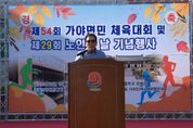 [경남도민뉴스=김춘호 기자] 합천군 가야면은 26일 해인중학교 운동장에서 제54회 가야면민체육대회 및 제29회 노인의 날 기념행사를 개최했다. 가야면 체육회(회장 임재후)가 주최하고 대한노인회 가야면분회(회장 김상원)가 주관한 이번 행사는 기념식과 체육행사, 문화공연 순으로 진행됐으며, 김윤철 합천군수와 신성범 국회의원, 장진영 경상남도의회의원, 신명기, 조삼술 합천군의회의원 등을 비롯한 지역 어르신 800여명이 참석했다. 이날 기념식에서는 그간 우리 지역의 노인복지 증진과 지역발전을 위해 헌신해 온 한판명 사촌1구 경로당 회장 외 10명에 대한 표창 및 감사패와 지역의 체육발전에 공헌한 학생에 대한 장학금이 수여됐다. 임재후 가야면 체육회장은“본 행사를 위해 바쁘신 중에도 참석하여 자리를 빛내주신귀빈 여러분들께 감사드리며, 이 행사를 준비해주신 여러 관계자분들에게도 감사드린다. 본 행사를 통해 가야면의 건강과 화합을 다지고, 어르신들도 건강하고 의미있는 시간이 되시기를 바란다”며 축사를 전했다.