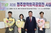 [경남도민뉴스=박만수 기자] 청주시가 후원하고 (사)청주연극협회가 주최‧주관한 제3회 청주 창작희곡 공모전 시상식이 21일 임시청사 직지실에서 개최됐다. 이번 공모전은 한국 연극계의 새로운 목소리를 발굴하고 창작희곡의 활성화를 도모하기 위해 마련됐으며, 전국에서 다양한 소재와 형식을 담은 77편의 작품이 출품되는 등 뜨거운 관심을 모았다. 심사는 연출가, 극작가 등 연극 전문인으로 구성된 심사위원단이 맡아 작품의 완성도, 독창성, 실연성의 3개 항목에 대한 심사를 진행해 최종 3개의 작품을 선정했다. 최종 선정된 작품은 독창성이 높고 무대화의 가능성이 높다고 평가된 작품으로 대상(상금 1,500만원)은 이홍이 작가의 ‘모스크바의 바다’, 최우수상(상금 1,000만원)은 노동훈 작가의 ‘고민수의 변수 통제 시뮬레이션’, 우수상(상금 500만원)은 서준교 작가의 ‘다이치’에 영광이 돌아갔다. 수상작들은 저작권 계약을 맺고 청주 극단에 공연 제작 우선권을 지원하게 된다. 상을 수여한 이범석 청주시장은 “창작희곡은 한국 연극의 뿌리를 지탱하는 중요한 장르로, 이번 공모전을 통해 참신한 극작가들