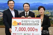 (거창/최병일) = BNK 경남은행 거창지점(지점장 심규열)은 22일 거창군청을 방문해 추석명절을 맞아 관내 저소득층에게 전달해 달라며 온누리 상품권 700만원을 기탁했다. 이날 전달식에 참석한 심규열 지점장은 “어려운 이웃에게 명절 쇠는 부담을 조금이나마 덜어주고 지역 경제 활성화에 도움이 되기를 바란다”며 기탁 의사를 밝혔다. 이에 따라 거창군에서는 기탁 받은 상품권을 읍면장의 추천을 받아 5만원씩 140세대에 전달할 예정이다. 경남은행 거창지점에서는 작년에도 소외계층을 위해 여름이불세트, 김장김치와 전기장판 등 4회에 걸쳐 2천3백만 원 상당의 물품을 전달했다. 해마다 설과 추석을 맞아 온누리 상품권을 기탁하며 지속적인 사회공헌 활동을 하고 있다.