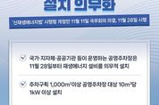 [경남도민뉴스=백형찬 기자] ■ 공영주차장 태양광설비 설치 의무화 '신재생에너지법' 시행령 개정안 11월 11일 국무회의 의결, 11월 28일 시행 - 국가·지자체·공공기관 등이 운영하는 공영주차장은 11월 28일부터 재생에너지 설비를 의무적 설치 - 주차구획 1,000㎡이상 공영주차장 대상 10㎡당 1kW 이상 설치 ※ 11월 28일부터 1년간 설치 계획서를 받아 시행