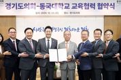 [경남도민뉴스=김동규 기자] 경기도의회는 23일 오전 의장 접견실에서 동국대학교와 교육협력 및 학술교류를 위한 업무협약(MOU)을 체결했다. 이날 협약식에는 김진경 의장(더민주, 시흥3)과 고준호 의원(국민의힘·파주1), 김완규 의원(국민의힘·고양12), 이병숙 의원(더민주·수원12), 박호순 의정국장이 참석했다. 동국대학교에서는 윤재웅 총장, 김용현 교무부총장, 김승용 대학원장, 유한림 BMC(바이오메디캠퍼스) 행정처장 등이 함께 자리해 협약의 의의를 더했다. 양 기관은 이번 협약을 계기로 ▲의정 발전을 위한 정보 교류 ▲전문 인재 양성을 위한 교육·연구 지원 ▲도의원 및 의회 직원 대상 대학원 장학금 지원 등 의정 활동 역량 강화를 위한 체계적인 교육 협력에 나서기로 했다. 윤재웅 총장은 “대학의 교육·연구 역량을 공유함으로써 경기도 발전에 기여할 수 있게 되어 뜻깊다”며 “경기도의회와의 지속적인 협력을 통해 실효성 있는 교육 지원을 이어갈 수 있도록 최선을 다하겠다”라고 말했다. 김진경 의장은 “의회에 대한 도민의 기대는 점점 더 복잡해지고 다양화되고 있는 만큼 의회 구성원 모두가