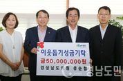(합천/권연홍 기자) = 합천군 류순철 경남도의원은 20일 합천군(군수 하창환)을 방문하여 어려운 이웃을 위해 써달라며 올해 세비 5천만원을 전액 기탁하여 주위를 훈훈하게 하고 있다. 류순철 의원은 작년에 이어 올해 2번째 세비를 기탁하는 것으로 몸소 나눔을 실천하고 있다. 류의원의 세비 기탁은 6·4지방선거에 나서면서 4년 임기 세비 전액을 어려운이웃을 위해 기탁하겠다고 공식 선언했고, 이후 2년째 그 약속을 지키고 있다. 류의원은 “지역의 어려운 이웃을 위해 진심으로 돕고 싶었고, 지역 발전을 위해 항상 최선을 다하고 있다. 앞으로도 지속적으로 세비를 기탁해 지역내 나눔문화 확산에 기여하겠다”고 소감을 밝혔다. 하창환 합천군수는 “류의원의 세비 기탁과 군민과의 약속을 실천하는 행동에 무한한 감사를 드린다. 류의원의 뜻이 헛되지 않도록 관내 어려운 이웃을 위해 쓰겠다고” 말했다. 합천군은 기탁자의 뜻에 따라 경남사회복지공동모금회를 통해 관내 어려운 가정 등에 전달할 예정이다.