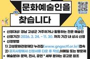 [경남도민뉴스=김태수 기자] (재)고성문화관광재단은 지역 예술인 정보의 통합적·체계적 관리 기반을 마련하고 문화예술 지원사업의 효율적 운영을 도모하기 위해 '2026 지역 예술인 DB 등록·구축 사업'을 추진한다. 그동안 지역 예술인 현황에 대한 체계적인 자료가 부족하여 문화예술 지원사업 연계에 어려움이 있었던 점을 개선하고자, 전문 예술인을 대상으로 데이터베이스(DB)를 구축하고 전용 홍보 플랫폼 운영을 추진하고자 한다. 신청 대상은 경남 고성군에 거주하거나 활동 중인 전문 예술인으로, 문학·전시·공연 등 전 분야에 걸쳐 신청할 수 있다. 신청 기간은 11월 30일까지이며, 이메일 또는 재단 방문 접수를 통해 신청할 수 있다. 구축된 DB는 향후 재단의 문화예술 지원사업, 축제, 교육, 공모 사업 기획으로 지역 예술인의 참여 기회를 확대하는 핵심 자료로 적극 활용될 예정이다. 재단 관계자는 “이번 사업은 단순한 정보 수집을 넘어 지역 예술인의 지속 가능한 창작 환경을 조성하고, 고성 문화예술 경쟁력을 강화하기 위한 기반 사업”이라며, “지역 예술인들의 많은 관심과 참여를 기대한다”라고