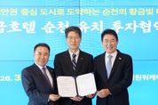 [경남도민뉴스=최인태 기자] 전라남도는 13일 순천 정원워케이션센터에서 ㈜제너시스비비큐와 호텔·컨벤션 등을 포함한 복합 관광단지 조성을 위한 투자협약을 했다. 협약식에는 황기연 전남도지사 권한대행과 윤홍근 제너시스비비큐 회장, 노관규 순천시장 등이 참석했다. 전남도는 이번 투자가 순천의 생태·정원 자원과 관광 인프라를 연계해 전남 동부권이 남해안 관광벨트의 중심축이자 글로벌 관광·레저 중심지로 자리매김하는 경쟁력을 강화하는 계기가 될 것으로 기대하고 있다. 순천은 대한민국 대표 생태수도라는 명성에 걸맞은 대규모 숙박시설을 갖추게 되면서 단순히 스쳐가는 관광지를 넘어 ‘체류형 관광’ 기반을 확대하는데 도움이 될 전망이다. 또한 2천여 개의 신규 일자리 창출과 관광객 유입 확대를 통해 지역경제 활성화에도 기여할 것으로 예상된다. 제너시스비비큐는 2031년까지 순천시 연향·오천·해룡 일원에 복합 관광단지를 조성할 계획이다. 주요 시설로는 ▲500~1천 실 규모 랜드마크 호텔 ▲국제회의가 가능한 컨벤션센터 ▲워터파크 ▲상업시설 등이 들어설 예정이다. 특히 이번 관광 복