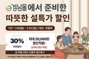 [경남도민뉴스=구인애 기자] 경상남도와 (재)경상남도투자경제진흥원이 운영하는 e경남몰은 1월 26일부터 예산 소진 시까지 ‘2026년 풍성한 설맞이 할인 기획전’을 진행한다. 이번 기획전은 명절 선물 세트를 포함한 e경남몰의 모든 상품에 30%(최대 2만 원) 할인 혜택을 제공하며, 입점 업체별로 자체 할인 행사도 함께 진행돼 실제 구매 시 적용받는 할인 혜택은 더 크다. 2월 12일까지 결제 완료한 주문 상품은 설 명절 이전에 배송받을 수 있으며, 단체 또는 대량 주문을 원하는 경우 e경남몰 고객센터 또는 e경남몰 다중배송시스템을 통해 편리하게 이용할 수 있다. e경남몰에서는 시군별 발행하고 있는 지역사랑상품권(모바일)을 사용할 수 있어 10~15% 할인된 지역사랑상품권으로 결제 시에는 더욱 가벼운 장바구니 물가로 명절을 준비할 수 있다. 황영아 도 소상공인정책과장은 “e경남몰 설 기획전을 통해 도민들의 생활 물가 부담 완화에 도움이 되고, 지역 소상공인들에게 매출 확대의 기회가 되길 바란다”라고 말했다.