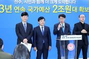 [경남도민뉴스=최인태 기자] 전주시가 3년 연속으로 2조 원대 국가 예산을 확보하면서 새로운 전주를 만들 밑거름을 한층 더 단단히 다질 수 있게 됐다. 우범기 전주시장과 이성윤 국회의원(더불어민주당, 전주시을)은 4일 시청 4층 대회의실에서 2026년 국가예산 확보 관련 브리핑을 열고, 내년도 국가 예산으로 올해 당초 예산(2조 1595억 원)보다 1340억 원(6.2%) 늘어난 2조 2925억 원을 확보했다고 4일 밝혔다. 내년도 국가 예산을 분야별로 살펴보면 △경제·산업 분야 8560억 원 △광역·도시 분야 2767억 원 △문화·관광 분야 1383억 원 △복지·사회안전망 분야 1조 215억 원이다. 먼저 경제·산업 분야에서는 △협업지능 피지컬 AI 기반 SW플랫폼 연구개발 생태계 조성(766억 원) △AI 신뢰성 검증 허브센터 구축(10억 원) 등 AI시대를 선도하기 위한 예산을 확보했으며, △국립 전주전문과학관(5억 원) △반도체 공동연구소 운영(47억 원) △글로벌 혁신의료기술 실증지원센터(12억 원) 등 글로벌시장 경쟁력을 강화하고 차세대 신성장 산업을 주도할 예산도 챙겼다. 또, △탄소소재국가산업단