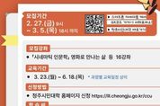 [경남도민뉴스=박만수 기자] 청주시평생학습관은 2026년 1학기 ‘청주시민대학’에 참여할 학습자를 3월 5일까지 모집한다고 27일 밝혔다. 청주시민대학은 민선 8기 공약사업으로 시민들에게 수준 높은 평생교육을 제공하는 프로그램으로, 대학교수와 분야별 전문가를 강사로 초빙해 시민 역량 강화를 위한 다양한 교육과정을 운영한다. 시민들은 관심 분야에 따라 맞춤형 강좌를 선택해 수강할 수 있다. 청주시민이라면 누구나 신청 가능하며, 청주시민대학 누리집에서 회원 가입 후 신청하면 된다. 시는 신청자 중 무작위 추첨을 통해 400여명을 선발할 계획이다. 교육은 3월 23일부터 12주간 청주시평생학습관에서 진행된다. 청주학·시민학 강좌를 포함해 총 100시간 이상 수료한 시민에게는 청주시장 명의의 명예학사 학위를 수여한다. 이번 학기에는 총 6개 분야 16개 강좌가 운영된다. 주요 강좌는 △인문학 5개(‘와인, 알고 마시면 100배 즐겁다’, ‘시네마틱 인문학: 영화로 만나는 삶’ 등) △문화예술학 4개(‘미술과 인생’, ‘뮤지컬 명곡 마스터 클래스’ 등) △미래학 1개(‘똑똑한 AI 비서와 함께하는 온라인 비
