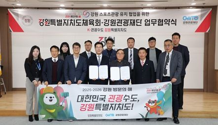[경남도민뉴스=표재민 기자] 강원관광재단과 강원특별자치도체육회는 1월 22일 강원체육회관에서 스포츠관광 분야의 상호 협력을 위한 업무협약(MOU)을 체결했다.