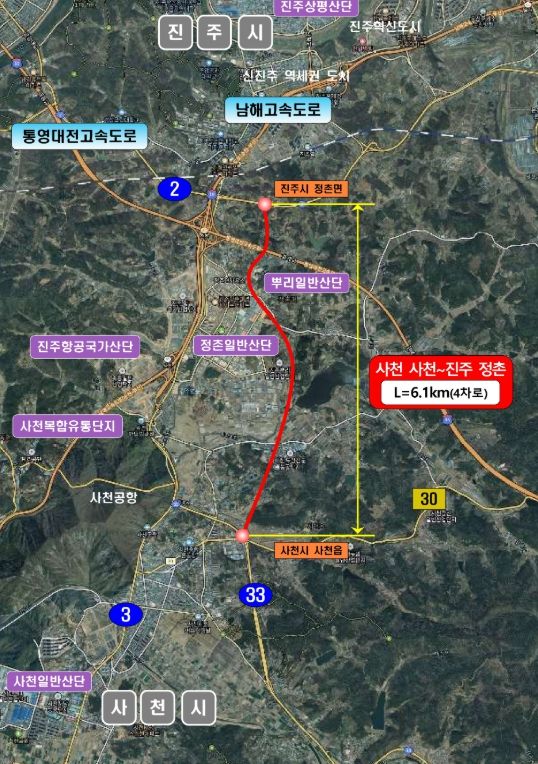 사천~진주 정촌 국도대체우회도로는 길이 6.08km, 폭 20m 구간의 국도 3호선 신설 사업으로 총사업비 2080억 원이 전액 국비로 투입된다.