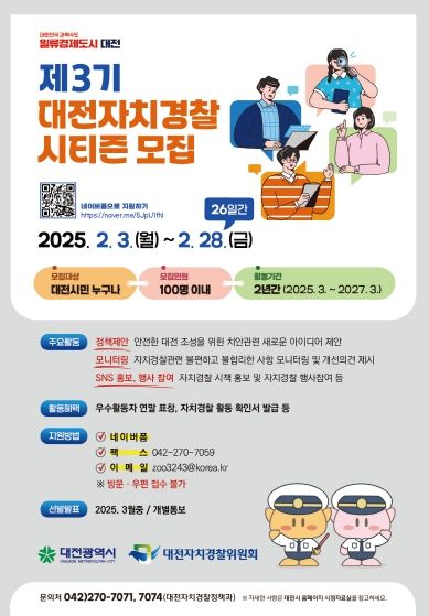 대전자치경찰위원회는‘제3기 자치경찰시티즌’을 2월 28일까지 공개 모집한다고 밝혔다.