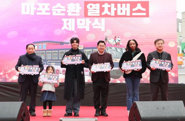이후 박강수 마포구청장과 정동원 등 참여자들은 제막 퍼포먼스로 ‘마포순환열차버스’의 성공적인 출발을 알렸다.